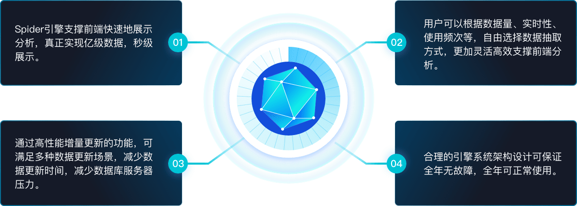 OPENBI 5.0将直接對接數(shù)據庫的實時(shí)數(shù)據引擎與抽取數(shù)據的引擎整合統一為(wèi)spider計(jì)算(suàn)引擎。