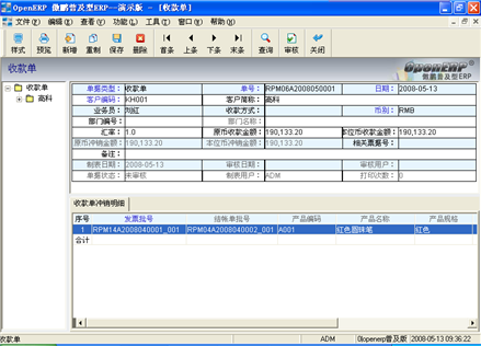 登錄系統後,在左邊的模塊區(qū)中,找到“應收管理(lǐ)/應收帳款收款/收款單”後雙擊它,進入“收款單”窗口(見圖9),此文件櫃對由應收發票(piào)生(shēng)成的收款單進行(xíng)查看、修改,然後審核單據