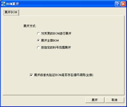 展開(kāi)前首先驗證BOM是否存在循環調用(全部):可(kě)以選擇在展開(kāi)BOM前是否對所有(yǒu)BOM進行(xíng)循環調用驗證