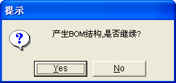 在右上(shàng)窗口中輸入或選擇需進行(xíng)齊套分析的料品後,點擊菜單項“功能/産生(shēng)BOM”或點擊相應圖标,出現如圖13的詢問框,在圖13中選擇“Yes”則産生(shēng)料品的BOM結構,并将結果反應在圖12右下窗口的“BOM結構”标簽頁中;選擇“No”則取消産生(shēng)BOM操作(zuò)