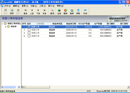 登錄系統後,在左邊的模塊區(qū)中,找到“物控管理(lǐ)/制(zhì)造單/銷售訂單轉制(zhì)造單”後雙擊它,進入“銷售訂單轉制(zhì)造單”窗口(見圖9),此文件櫃将已審核但(dàn)未結案的銷售訂單轉制(zhì)造單。