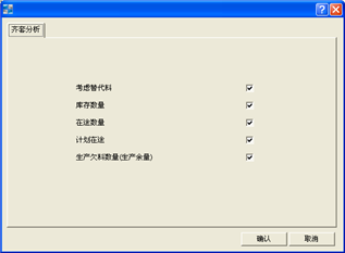 在右上(shàng)窗口中選擇需進行(xíng)齊套分析的料品後,點擊菜單項“功能/齊套分析”或點擊相應圖标,出現如圖15的詢問框,在圖15中選擇齊套分析需要考慮的條件,選擇好後,點“确認”則對選擇的齊套分析文件櫃右上(shàng)窗口中的所有(yǒu)料品進行(xíng)齊套分析,并将結果反應在圖12右下窗口的“分析結果”标簽頁中;選擇“取消”則取消齊套分析操作(zuò)