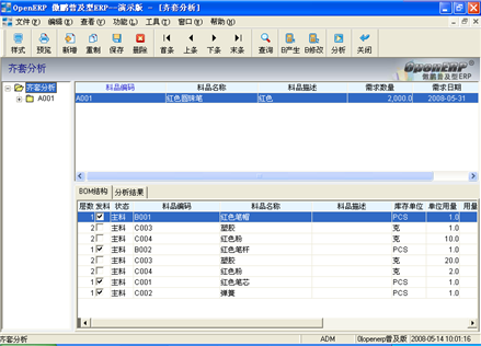 具體(tǐ)操作(zuò):在右上(shàng)窗口中輸入料品編碼、需求數(shù)量、需求時(shí)間(jiān)後保存;再點擊菜單項“功能/産生(shēng)BOM”或相應圖标,将産生(shēng)此料品的BOM結構;再點擊菜單項“功能/更改BOM”或相應圖标,更改某些(xiē)料品的發料标志(zhì);再點擊菜單項“功能/齊套分析”或相應圖标,将對此文件櫃中右上(shàng)窗口所有(yǒu)的料品進行(xíng)齊套分析