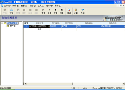 登錄系統後,在左邊的模塊區(qū)中,找到“制(zhì)造管理(lǐ)/制(zhì)造單/制(zhì)造收料重算(suàn)”後雙擊它,進入“制(zhì)造收料重算(suàn)”窗口(見圖11),此文件櫃對制(zhì)造單回寫的入庫數(shù)量和(hé)退庫數(shù)量進行(xíng)重新核算(suàn)