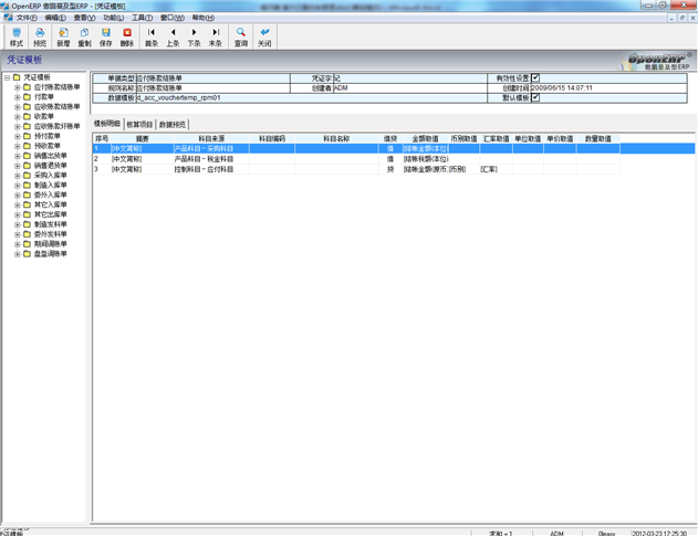 登錄系統後,在左邊的模塊區(qū)中,找到“總賬系統/會(huì)計(jì)接口/生(shēng)成憑證設置/憑證模闆”,進入“憑證模闆”窗口(如圖26),此文件櫃建立憑證模闆資料,供“憑證接口”文件櫃調用