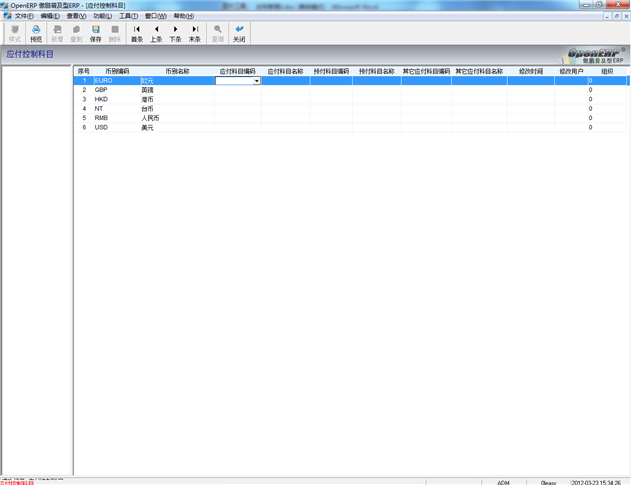 登錄系統後,在左邊的模塊區(qū)中,找到“總賬系統/會(huì)計(jì)接口/生(shēng)成憑證設置/應付控制(zhì)科目”,進入“應付控制(zhì)科目”窗口(如圖19),顯示的數(shù)據會(huì)根據3.1.1參數(shù)設置裏應付控制(zhì)科目依據顯示不同的欄位,當選擇按币别就是按币别設置科目編碼的,當選按料品類别就是按料品類别設置科目編碼的,打開(kāi)時(shí)自動讀取對應的數(shù)據