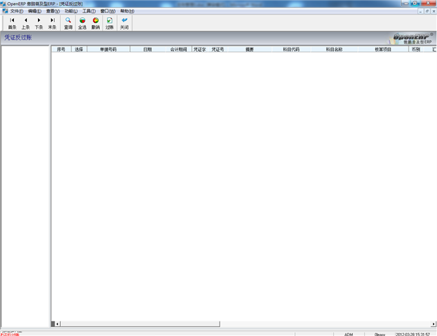 登錄系統後,在左邊的樹(shù)型圖中,找到“總帳系統/憑證處理(lǐ)/憑證反過賬”後雙擊它,進入“憑證反過賬”窗口(見圖35),此文件櫃讀取當前會(huì)計(jì)期間(jiān)已過帳的會(huì)計(jì)憑證數(shù)據,數(shù)據反過帳後在已審核狀态