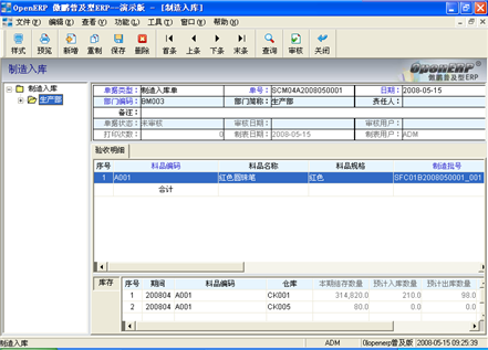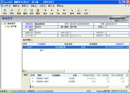 登錄系統後,在左邊的模塊區(qū)中,找到“庫存管理(lǐ)/制(zhì)造入退庫/制(zhì)造入庫”,進入“制(zhì)造入庫”窗口(見圖17),此文件櫃可(kě)以新建制(zhì)造入庫單據(注意:必須有(yǒu)制(zhì)造單),也可(kě)對由制(zhì)造單生(shēng)成的制(zhì)造入庫單進行(xíng)查看、修改,然後将單據審核