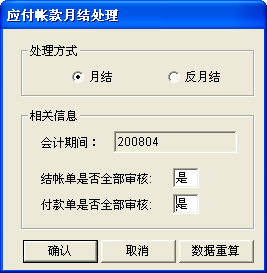 結帳單是否全部審核:指當前期間(jiān)的應付結帳單是否已全部審核,隻有(yǒu)全部審核才能做(zuò)月結操作(zuò);此欄位對于反月結操作(zuò)則不顯示